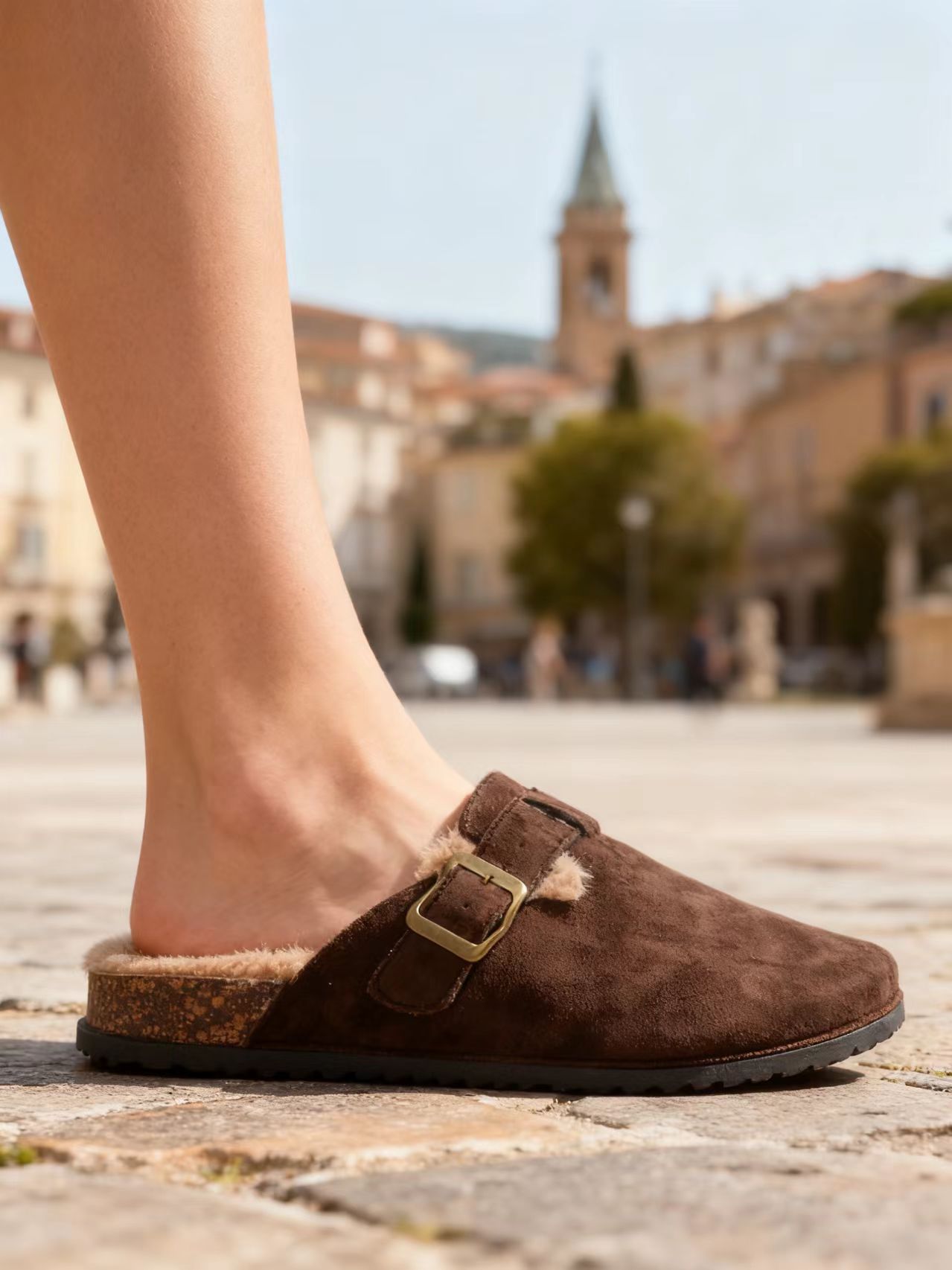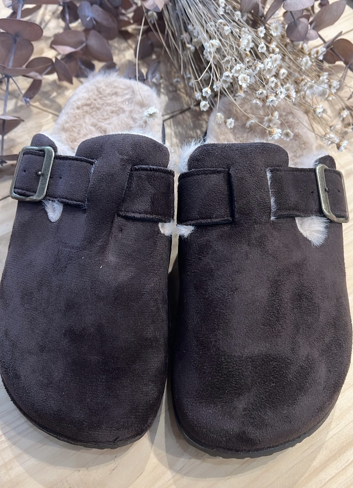 Zueco en marrón chocolate, el color tendencia; pelito por dentro súper suave; hebilla decorativa! Elige tu número habitual