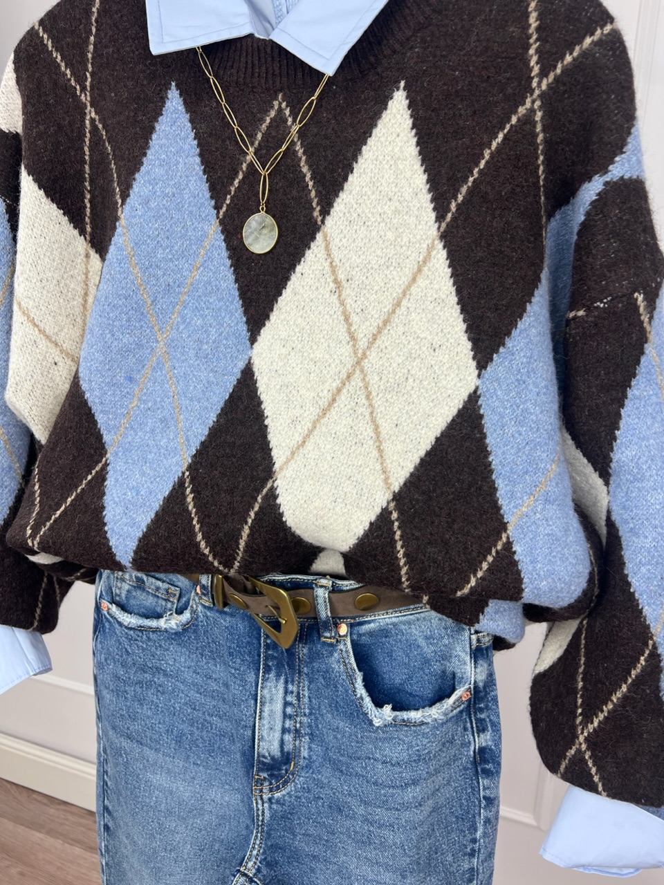 Jersey gordito de rombos en tonos marrones y azul. Talla única; ideal de la 38 a la 44