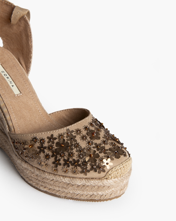 Plataforma tipo valenciana con cuña en yute. Corte con detalle de abalorios en contraste de color. Cierre mediante lazo anudado al tobi- lo. Altura del tacón 10 cm. Altura de la plataforma 3 cm.