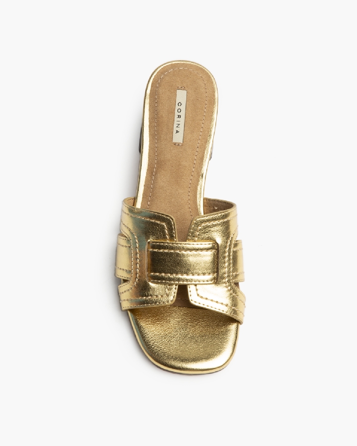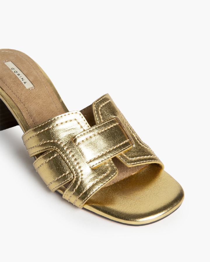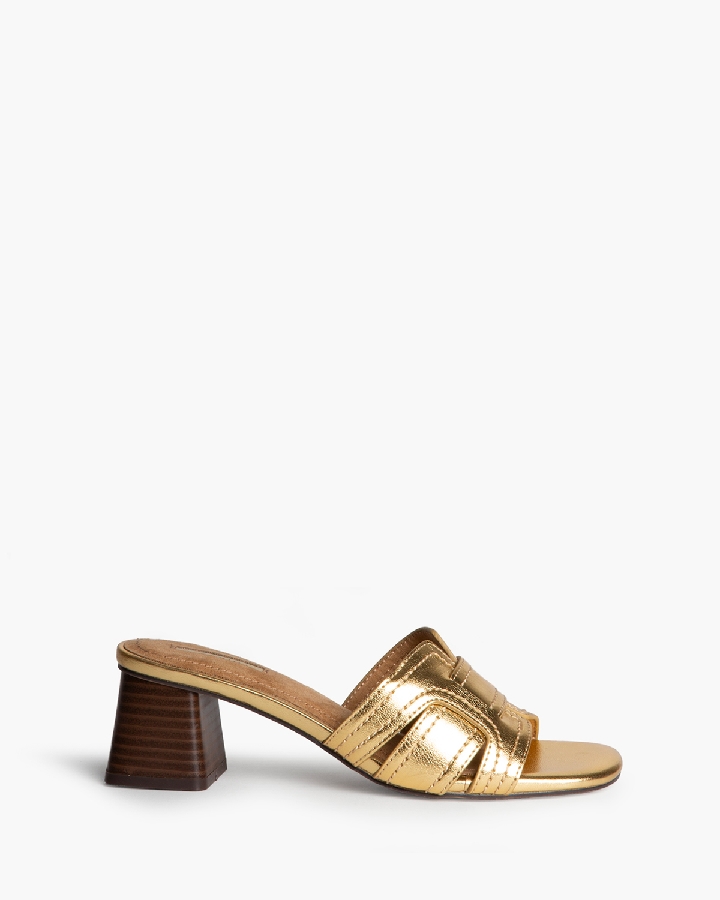 Sandalia de tacón bajo. Pala con corte simétrico y detalle de cosido. Tacón ancho y acabado en punta cuadrada. Altura del tacón 5 cm.