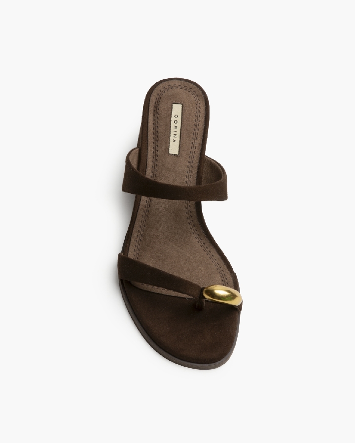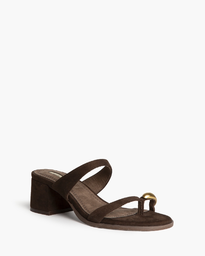 Sandalia de tacón bajo. Detalle de anillo en el dedo pulgar. Tacón ancho y acabado en punta redonda. Altura del tacón 5 cm.